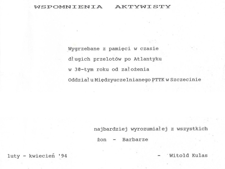 W związku z przygotowaniami do jubileuszu 60 lat OA PTTK postanowiłem przypomnieć i upowszechnić tekst, który powstał w 1994 r., kilka lat po tym, jak nie licząc działań w Akademickim Towarzystwie Chatkowym, wyłączyłem się z aktywności w Oddziale Akademickim PTTK w Szczecinie. (Pisany w programie Word Perfect, teraz został przekonwertowany do MS Word)
